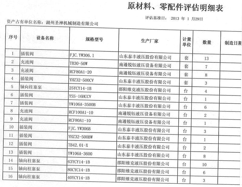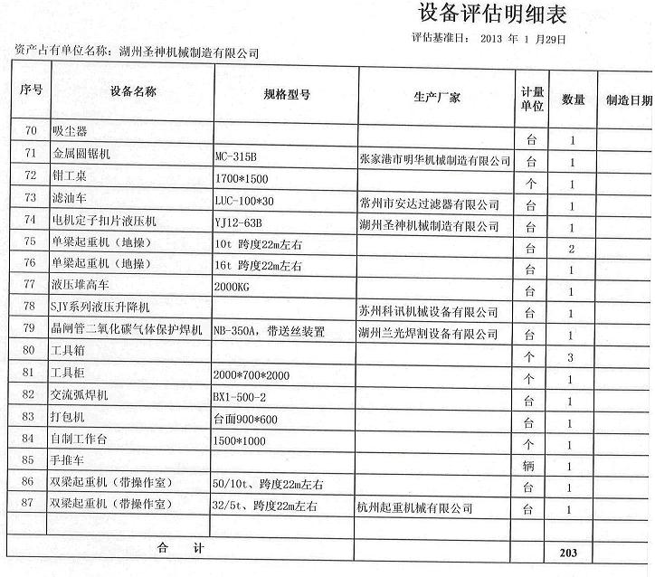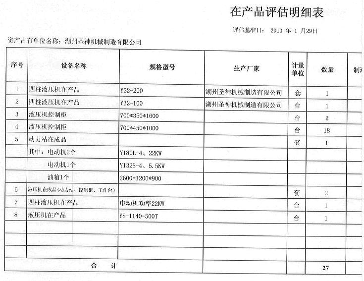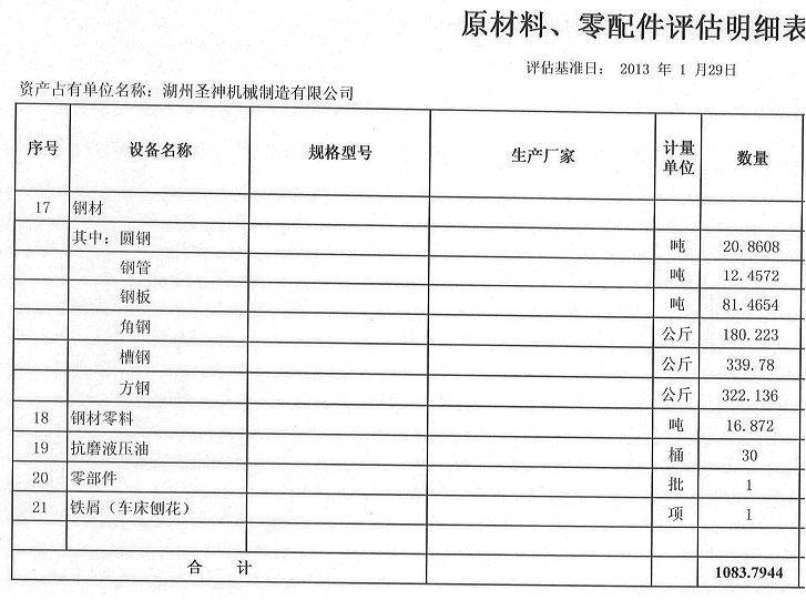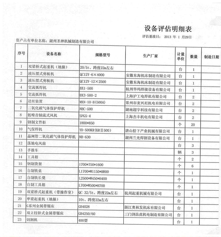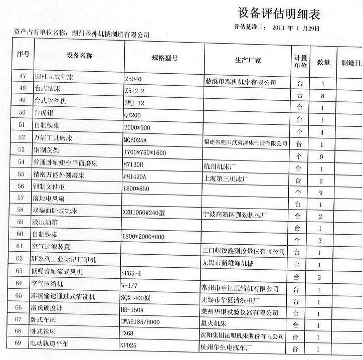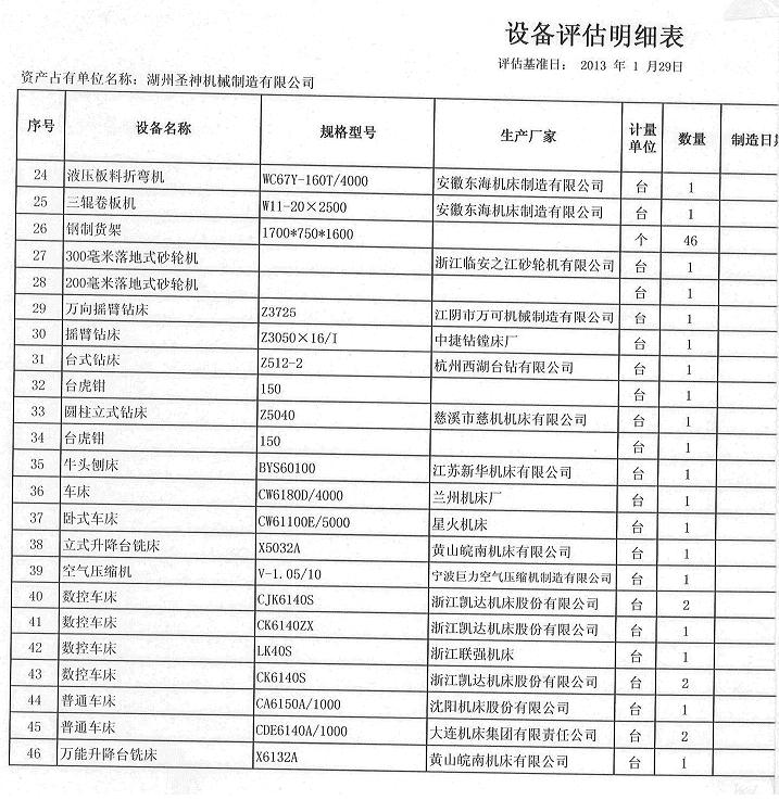 2、被執行人湖州圣神機械制造有限公司所有的位于該公司廠房內的機器 設備(車床、刨床、磨床、銑床、鉆床、鋸床、氣保焊機、起重機)、液壓機在產品、零部件、原材料(鋼材)等財產。起拍價340萬元(有保留價)。