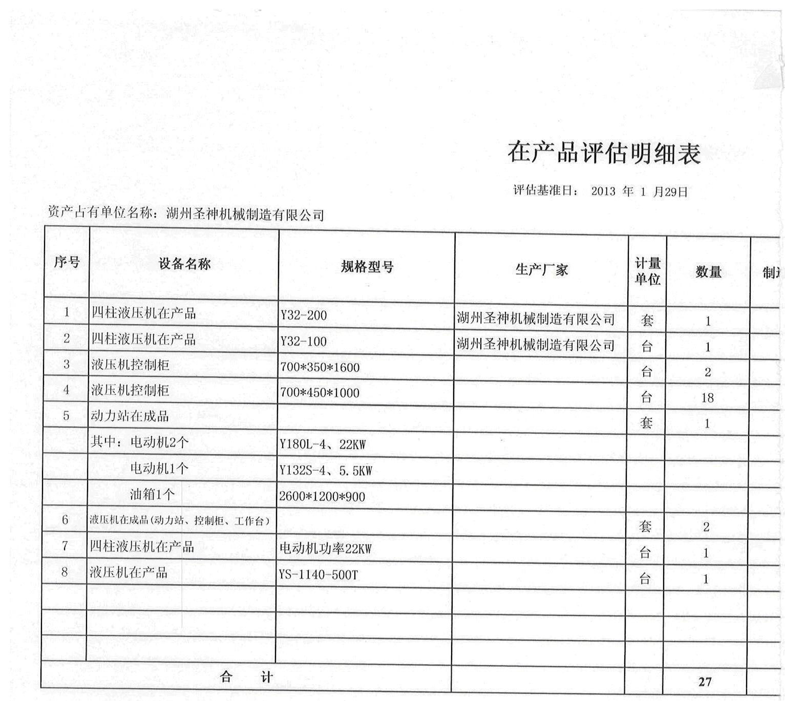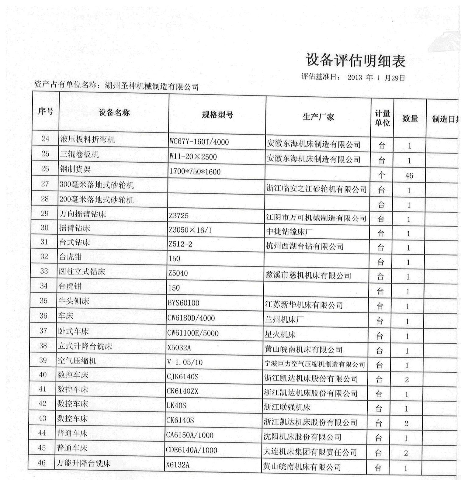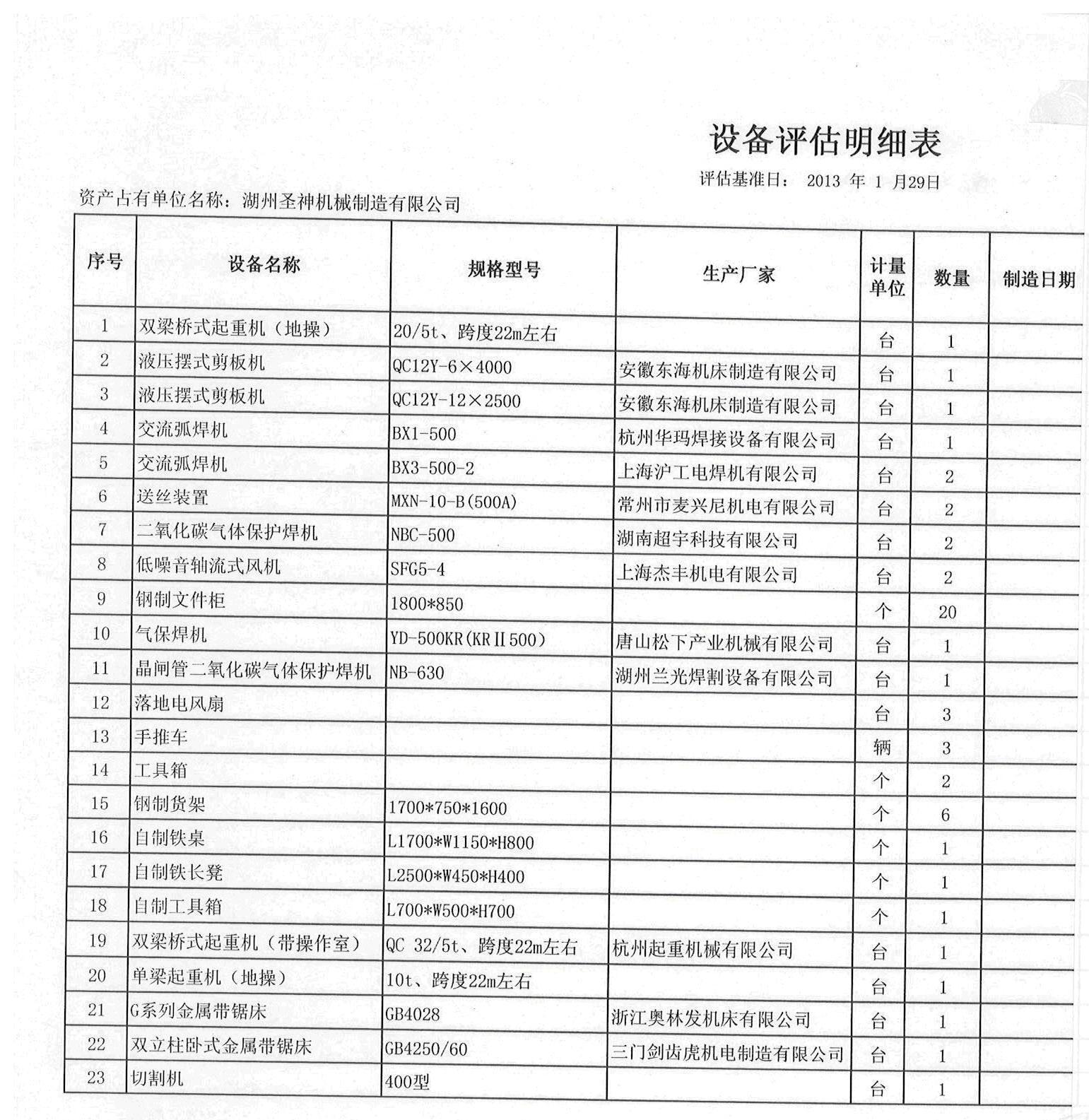 特別聲明:以下表格根據(jù)《湖州湖州圣神機械制造有限公司資產(chǎn)項目評估報告》提供,表內(nèi)所列設(shè)備名稱、規(guī)格型號、質(zhì)量、數(shù)量、重量等僅供參考。如有誤差不影響本次拍賣成交價,本公司不承擔(dān)擔(dān)保責(zé)任,一切以現(xiàn)狀為準(zhǔn)。