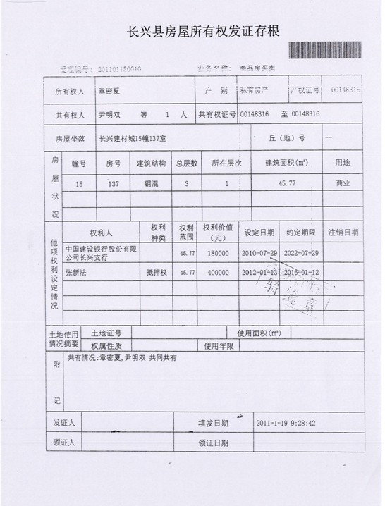 2、長(zhǎng)興縣雉城鎮(zhèn)建材城15幢137室房屋(商業(yè)),建筑面積45.77㎡,起拍價(jià)32.5萬(wàn)元。