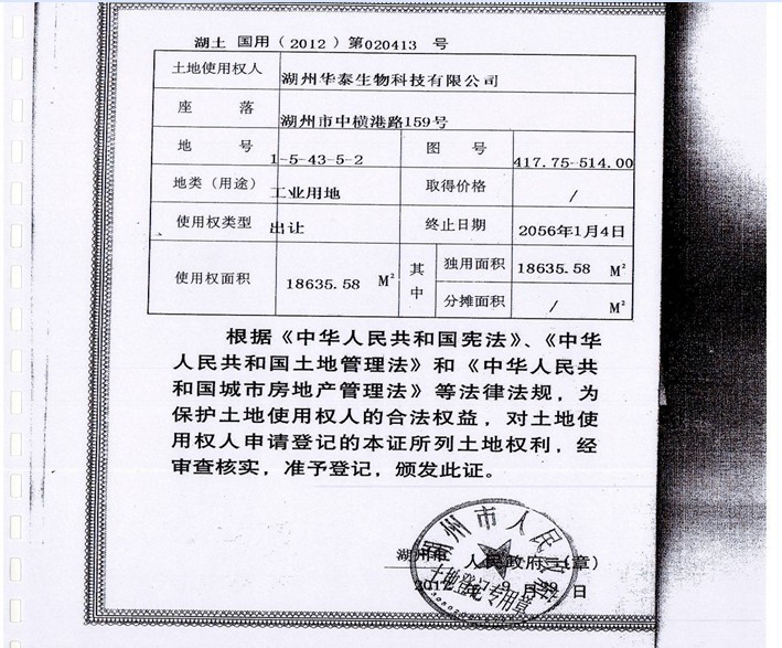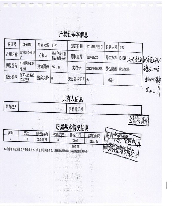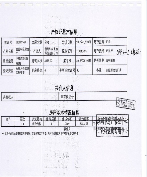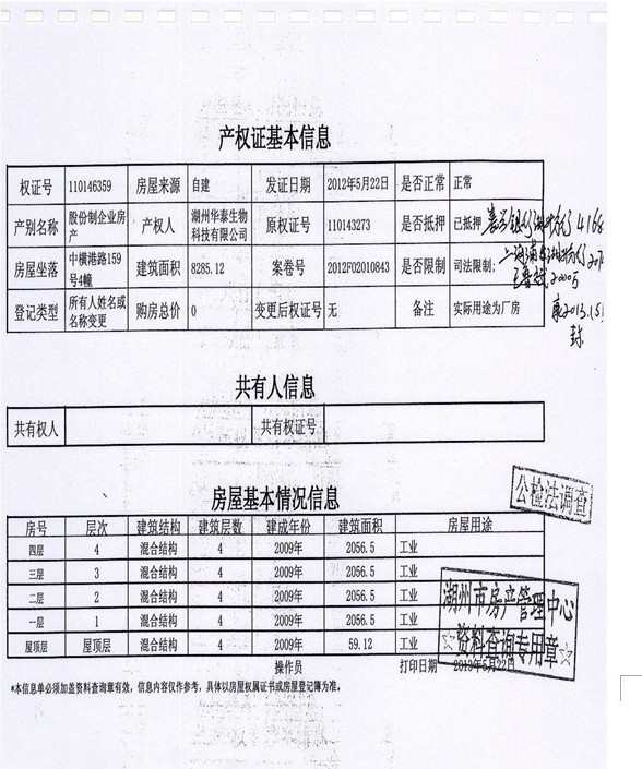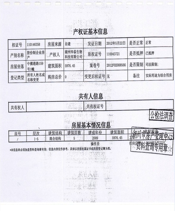 1、湖州市中橫港路159號1幢、2幢、3幢、4幢房產(24942.11㎡)及土地使用權(59594.56㎡),起拍價3370萬元,有保留價。(被執(zhí)行人湖州華泰生物科技有限公司有競買權)。
