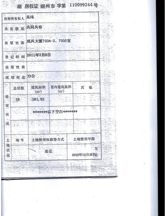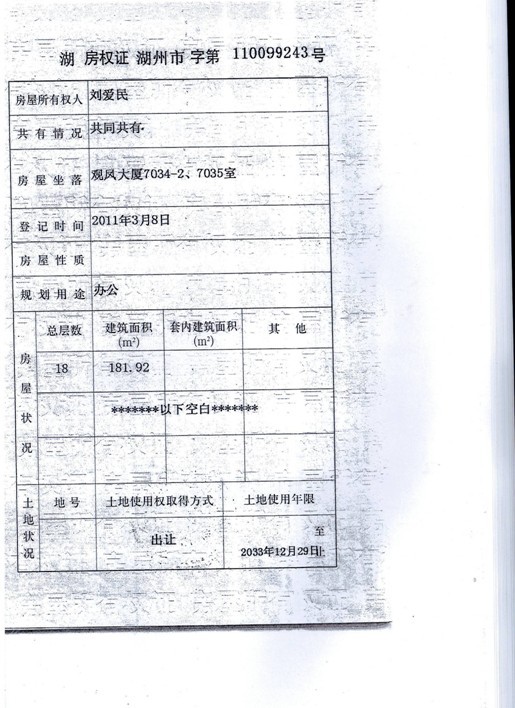 1、湖州市觀鳳大廈7034—2、7035室辦公用房181.92㎡,起拍價90萬元,(被執行人劉愛民、吳瑋、劉愛東、吳根英和湖州中弘紡織有限公司有競買權)。