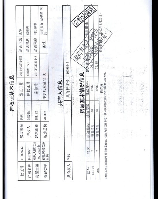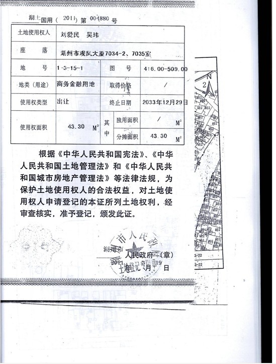 二、展示、報名時間和地點:自公告之日起至2013年12月4日16時止(以銀行轉賬入賬為準)。有意競買者須持有效證件,將標的起拍價10℅的競買保證金交入:戶名:湖州昆侖拍賣有限公司,開戶行:中國工商銀行吳興支行,賬號:1205 2302 1904 9127827(法院監管賬戶),到本公司辦理相關報名登記手續。