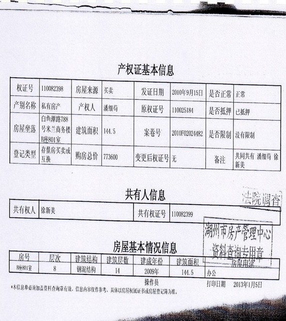 二、展示、報名時間和地點:自公告之日起至2014年1月23日16時止(以銀行轉賬入賬為準)。有意競買者須持有效證件,將標的起拍價10℅的競買保證金交入:戶名:湖州昆侖拍賣有限公司,開戶行:中國工商銀行吳興支行,賬號:1205 2302 1904 9127827(法院監管賬戶),到本公司辦理相關報名登記手續。